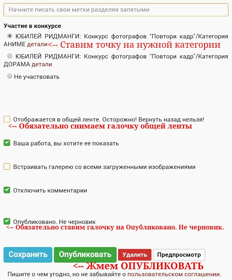 6. Нажимаем на кнопку "ВСТАВИТЬ КАРТИНКУ" либо ЗАГРУЖАЕТЕ РАБОТУ С КОМПЬЮТЕРА (в постах большой арт автоматически уменьшается). Работа участника появится в посте.7. Ниже в подзаголовке "Участие в конкурсе": - ОБЯЗАТЕЛЬНО ставим точку на тот конкурс, в котором хотите участвовать. - ОБЯЗАТЕЛЬНО снимаем галочку с пункта "Отображается в общей ленте" - ОБЯЗАТЕЛЬНО ставим галочку на пункт "Опубликовано. Не черновик". Проверяем правильность заполнения всех пунктов. Нажимаем на кнопку "Опубликовать"7. Готово! ВНИМАНИЕ: ЕСЛИ РАБОТА НЕ ОТВЕЧАЕТ УСЛОВИЯМ КОНКУРСА, ЯВЛЯЕТСЯ НЕЦЕНЗУРНОЙ ИЛИ НЕДОПУСТИМОЙ, ИЛИ СОДЕРЖИТ ДОПОЛНИТЕЛЬНЫЕ ПОСТОРОННИЕ ЭЛЕМЕНТЫ, ОНА МОЖЕТ БЫТЬ УДАЛЕНА ОРГАНИЗАТОРАМИ БЕЗ УВЕДОМЛЕНИЯ. В СЛУЧАЕ СОМНЕНИЙ СВЯЖИТЕСЬ ЗАРАНЕЕ С ОРГАНИЗАТОРАМИ В ЛС НА ПРЕДМЕТ ПРОВЕРКИ СООТВЕТСТВИЯ РАБОТЫ КОНКУРСУ.Список рекомендуемых проверенных хостингов:1. http://imgdisk.ru/2. http://fastpic.ru/3. https://upload.akusherstvo.ru/4. https://imgbb.com/5. http://funkyimg.com/