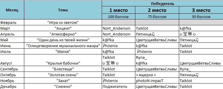 6. https://radikal.ru/Хостинги могут быть и иными, но перед загрузкой убедитесь, что они относятся к долгосрочным. Ваша ссылка должна быть активна как минимум два месяца на возможное время конкурса, а не деактивироваться через три дня. Photography monthly: Начисление баллов и награда: БАЛЛ: 1 место: 100 баллов 2 место: 75 баллов 3 место: 50 баллов НАГРАДА: по итогам года самому лучшему участнику достанется медаль в профиль (Лучший "Drawing monthly")Дисквалификация с мероприятия: