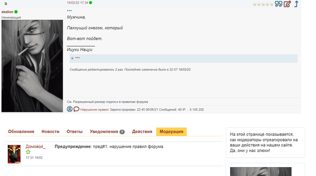 skallon wrote:Здравствуйте, внезапно обнаружил у себя грозное предупреждение#1 от господина модератора Домового _ за нарушение правил форума.) Действия модератора не оспариваю, понял, что был не прав, использовав в подписи фото, чуть-чуть, как оказалось, превышающее разрешенный размер, уже исправился.) Вопрос, за что пострадала цитата Моэма на английском, удаленная Домовым вместе с фотографией? Наверное, можно было и не трогать, никакие правила ею нарушены не были, ни размером, ни содержанием? Если уважаемый Домовой не владеет английским и ему что-то показалось, то персонально для него процитирую ее на русском: "Дымок папиросы растаял в воздухе — вот она, человеческая жизнь", мне больше нравится, как звучит оригинал. Не превышение ли это полномочий?) И второе, ранее общался с несколькими модераторами здесь, и опыт общения с ними мне подсказывает, что большинство из них слишком занятые люди, для того, чтобы выносить предупреждения за размер картинки в подписи, далеко не каждый стал бы это делать.) Чисто на тот случай, если уважаемый Домовой_ будет ходить за мной с лупой и ножницами, желая отстричь мне что-нибудь ненужное, можно ли в предупреждении указать, какое именно правило нарушено? А то мало ли, через какое-то время перед угрозой вечного бана придется доказывать, что мои ..цать предупреждений от Домового — это не за оскорбление пользователей, не за распространение порнографии и прочее "во все тяжкие".)) Или нарушение любых правил оценивается чисто механически (количественно)?