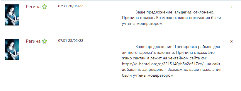 Filius Zect wrote:Сказали можно вопрос тут задать по поводу модерации. В общем создавал страницу для веб-манги которую автор публикует в пиксиве - модератор нашел ее на е-хентае и сказал что это хентай - только даже там она помечена "не-хентай" и в самой манге нет ни собственно хентая, ни эротики (на 14 вышедших сейчас страниц 1 с весьма скромным оголением в манге и то зацензуреным в разы больше чем есть на минте) вот сообщения  https://e-hentai.org/g/2227310/b4396f9cdb/ вот сама манга при том манга издаваемая по той же схеме на сайте уже есть вот https://mintmanga.live/farmacevt_oschastlivit_etu_izuvechennuiu_elfiiku