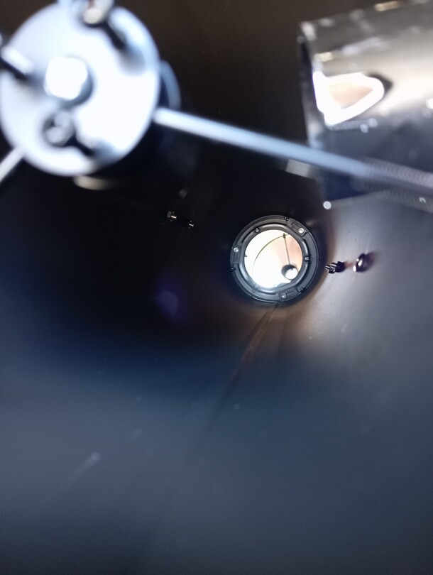 Штучка сверху - искатель. Грубо говоря прицел. В него ищешь интересующий тебя объект. В идеале то же самое должно быть видно и в окуляр, если оба зеркала стоят на одной линии. Вот чтоб они смотрели чётенько нужно делать юстировку - подкрутить их. У меня прицел сбит, но это неудивительно и не страшно (зеркала вполне могли растрястись во время доставки).