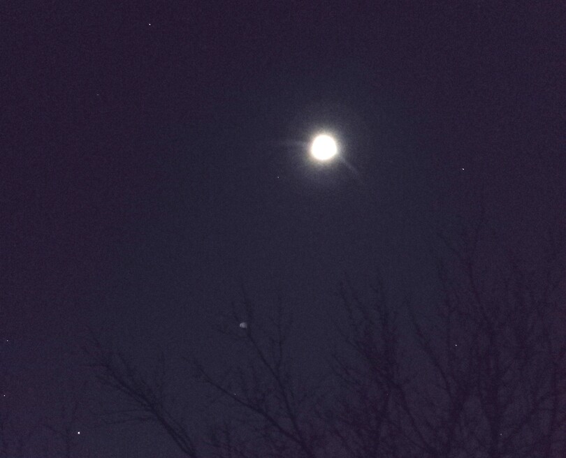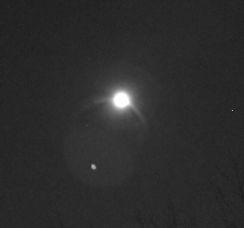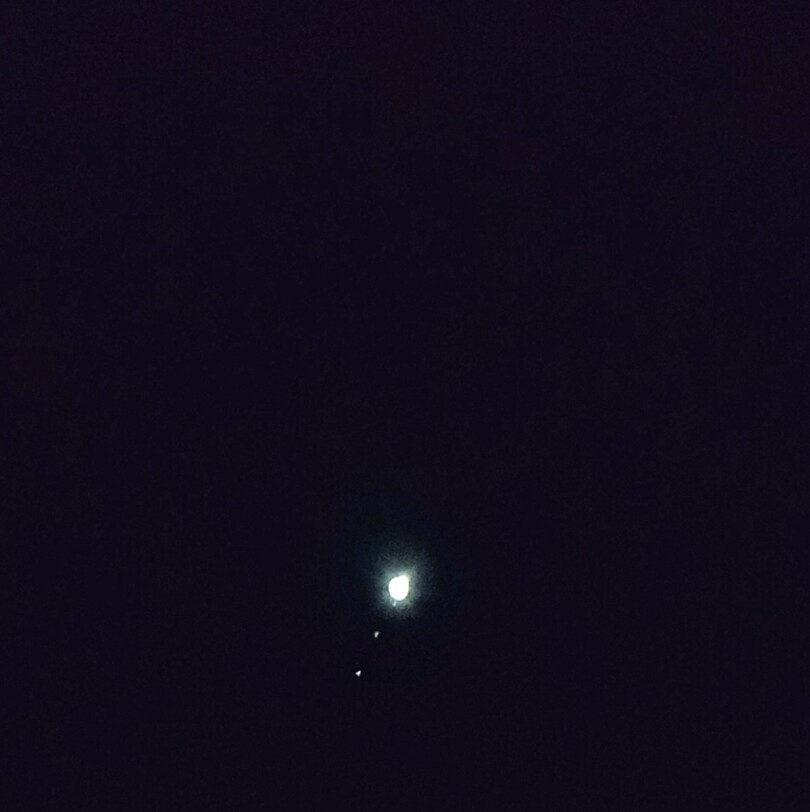 Левый нижний угол - яркая точка Юпитер, две вертикально стоящие звезды - Поллукс и Кастор (Близнецы).