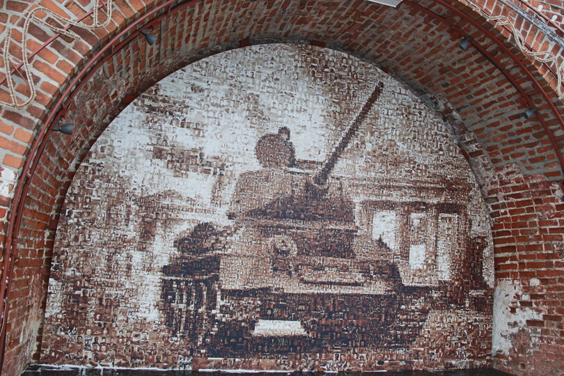 В стенах, в нишах за военной техникой - прекрасные пано, они составлены их фотографий героев Великой Отечественной Войны, нижегородцев.