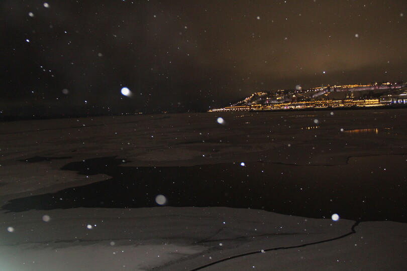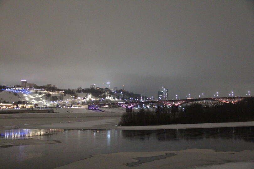 Уже темнеет, поэтому огоньки видать, но всё таки ещё видны просторы Волги, темные полыньи, что выглядит мрачновато, учитывая, что ты висишь на высоте над этой бездной...
