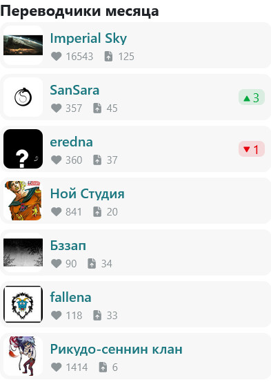 Сейчас мы изменили критерии, учитываются загруженные главы плюс спасибо юзеров, которые мы высчитываем в каком то количестве бананов, и строим на их основании рейтинг. Рейтинг обновляется ежемесячно (каждые 30 дней). Достижения в ежемесячном топе переводчиков также отображаются на странице персоны переводчика (над внешним видом потом поработаем).